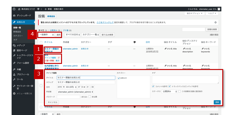 サブメニュー「クイック編集」をクリックすると、クイック編集画面が表示され、一覧画面から簡単な編集を行えます。