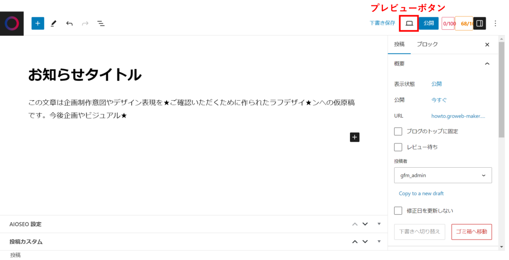 登録前にプレビューをご確認されたい場合は、右上の「公開」もしくは「更新」ボタンの左にある「プレビューボタン」(PCのアイコン)をクリックし、プレビューを見たい端末の種類を選択して「新しいタブでプレビュー」をクリックしてください。