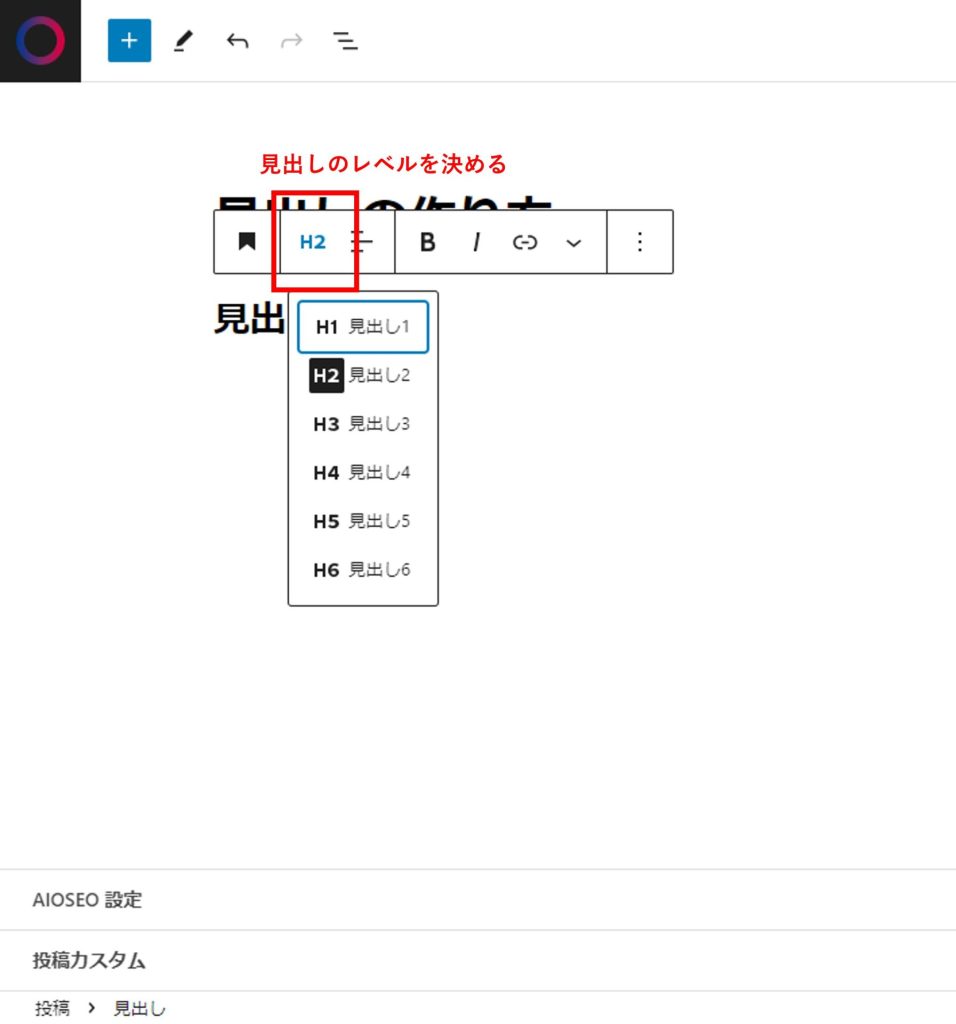 見出し上部に表示されているメニューより「H2」など「H○(数字)」をクリックすると中見出しや小見出しなど見出しのレベルを指定できます。