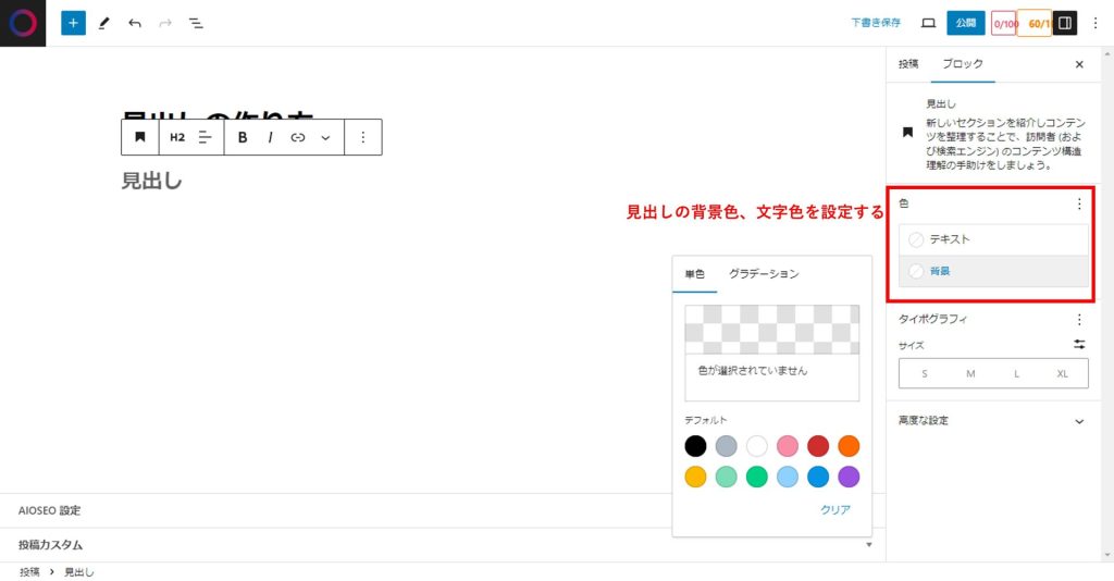編集画面右側のブロック編集メニューの「色」で指定できます。