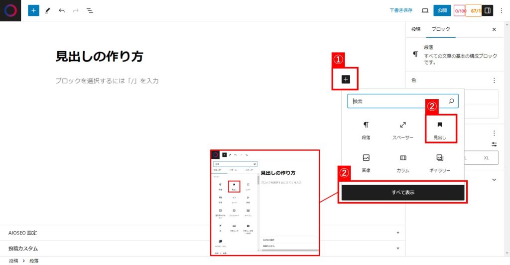※なければ、「すべて表示」をクリックしてすべてのブロックから「見出し」を選択する