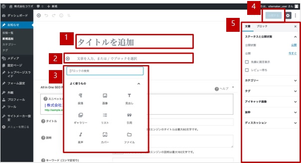 記事全体の設定を行う「文書」メニューと、各ブロックの設定を行う「ブロック」メニューがあります。