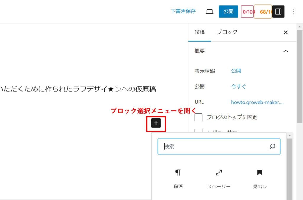 +ボタンをクリックすることで、ブロックの選択メニューが表示されます。