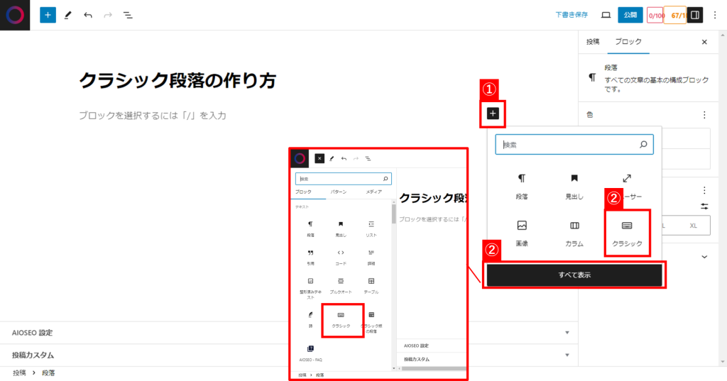 ※なければ、「すべて表示」をクリックしてすべてのブロックから「クラシック」を選択する